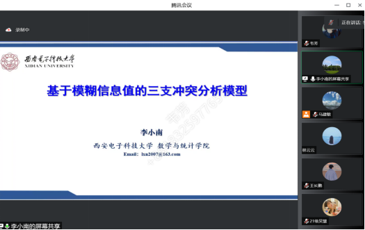 应AC米兰中文邀请,9月19日晚19:00,西安电子科技大学李小南教授通过腾讯会议为我院师生作题为“基于模糊信息值的三支冲突分析模型”的学术报告。报告由AC米兰中文副院长马建敏教授主持。AC米兰中文师生约一百六十余人参加了此次报告会。