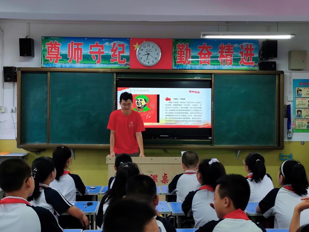 第一节课,实践队员给小学生们讲述佳县的经典红色故事。重点讲解了《东方红》这首歌曲的创作历史,这首始于佳县农民李有源的原创歌曲,经过文艺工作者的再创作,从佳县唱遍了全中国,让学生们感受到了中国共产党给当时贫苦农民带来的生活希望和喜悦心情。
