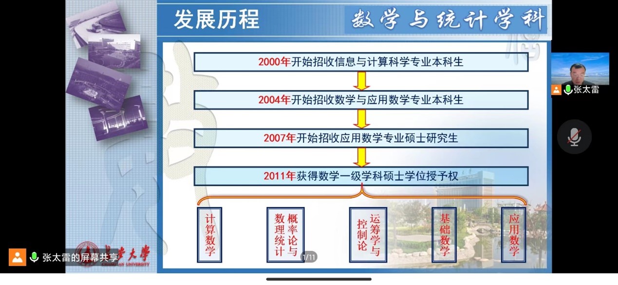 10月9日,数学和统计学专业通过腾讯会议开展专业教育讲座,研究生导师张太雷主讲。张老师对同学们来到AC米兰中文进行研究生阶段的学习表示了欢迎,向同学们介绍数学与统计专业发展历史和现状,强调数学与统计学在社会生活和未来发展中具有重要作用,希望大家珍惜在校学习时光,教导研究生正确选择研究方向,培养科研学术能力,告诫大家学术需保持认真严谨的态度。