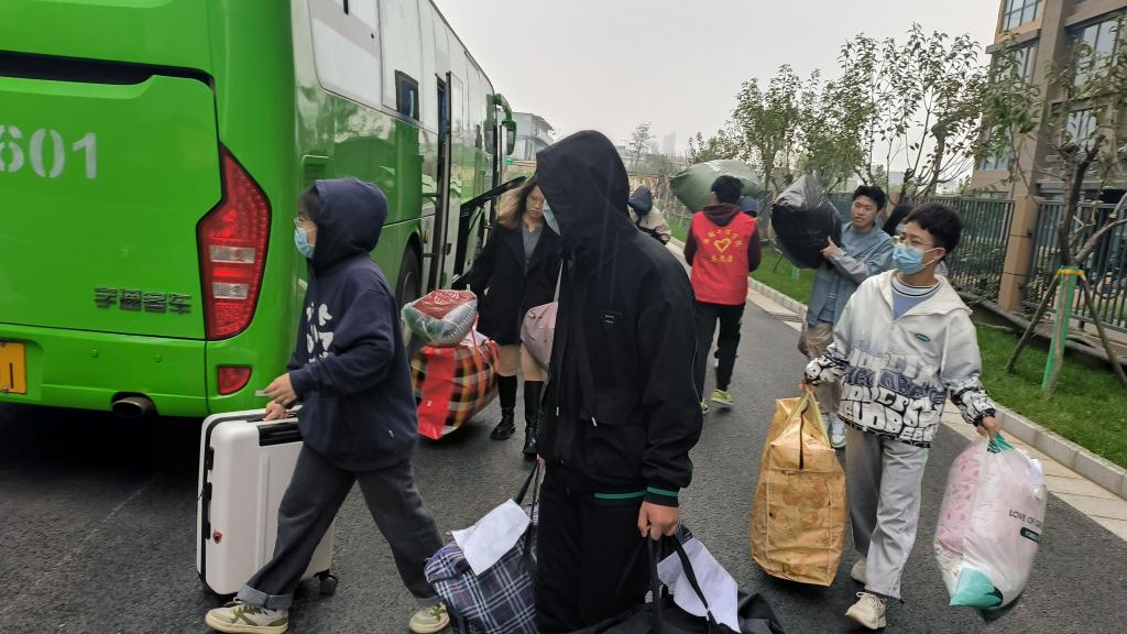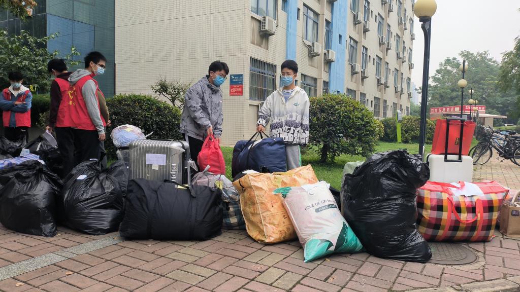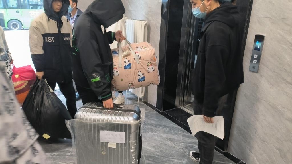 13日早9时30分,志愿者们在九号楼西侧集结,将预备返校学生行李贴上标签,并按顺序搬运上大巴前往21号学生公寓,在仔细核对每名学生的床位后一一放到指定位置。