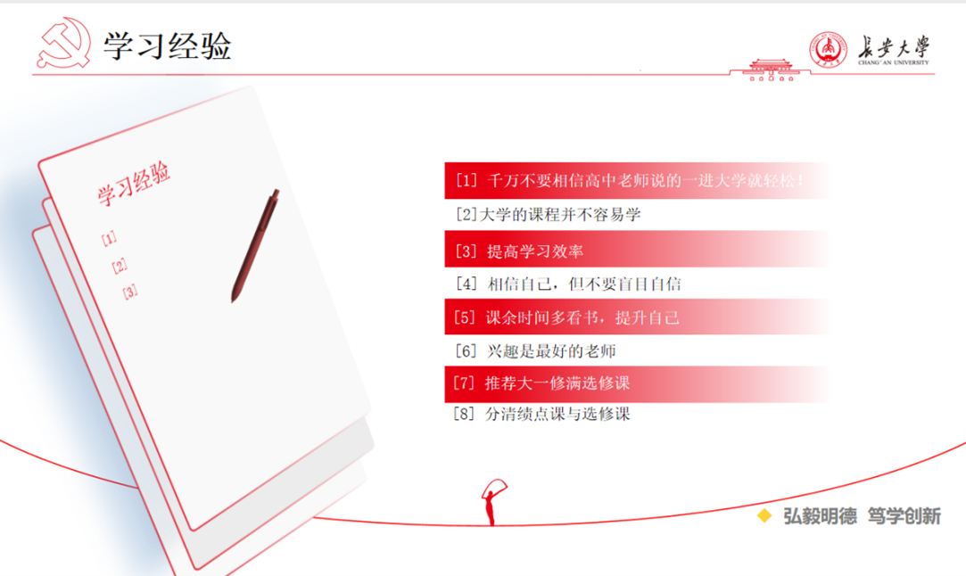 宣讲会上,郑昊楷和曹震分别介绍了大学期间获得的成果和学习经验。郑昊楷建议同学们合理规划时间,把学校规定的各项课程学好的同时积极参与科研项目;曹震提醒同学们要尽早树立目标,制定适合自己的学习方法,加强自律,要立长志而不是常立志。最后,杨雪菲对宣讲人的分享表示感谢,并希望新生同学们积极向两位优秀学长学习,不负大学时光。