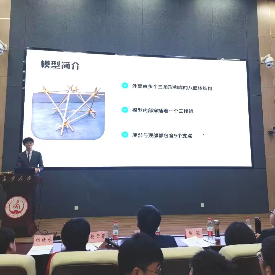 本次大赛得到了全校同学的积极响应,来自16个学院的76支队伍报名参赛,经过初赛的激烈角逐,最终12支队伍脱颖而出并顺利进入决赛。决赛分为PPT讲解,实物展示和评委提问三个环节。比赛开始,十二支队伍按抽签顺序依次上台通过PPT介绍自己作品的创意灵感以及其中蕴含的力学知识。紧接着,选手们依次展示自己的模型,通过现场演示向大家介绍模型的结构设计和受力分析。每组结束答辩后,评委针对模型设计和制作进行提问,并从结构的科学性、受力分析的合理性以及模型的创新型、实用性等方面进行打分。