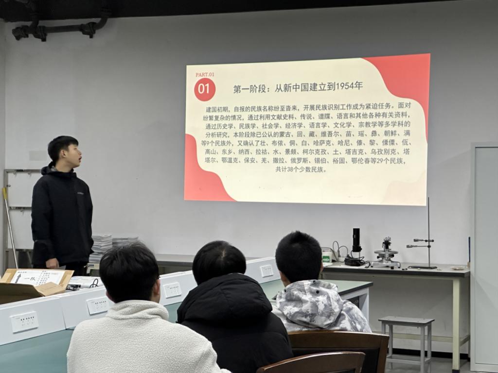 第一阶段,班级团支书周志豪为全体同学讲解民族团结的重要性和精神内核,以PPT的形式向全体同学展示我国相关法律规定和相关民族政策,学习党的民族理论。随后他向大家提问到“作为青年,如何做才能有利于民族团结?”引发了同学们的思考。班级成员分别从支持国家政策、关心身边少数民族的同学、了解参与少数民族特色活动等多个角度进行了细致的回答,结合学院的少数民族座谈话以及明信片展示等活动表达了自己的看法,认为通过传承中华优秀传统文化的方式,树立文化自信,增强文化认同感,才能在铸牢中华民族共同体意识方面发挥出青年力量!