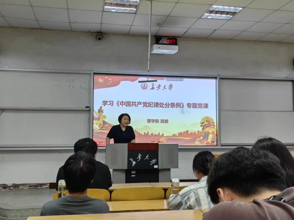 专题党课上,屈颖紧紧围绕党纪学习各项要求,从政治纪律、组织纪律、廉洁纪律、群众纪律、工作纪律、生活纪律六个方面,结合具体案例,带领党员对《中国共产党纪律处分条例》内容进行了逐章逐条学、联系实际学。屈颖强调,党员要深刻学习领会《中国共产党纪律处分条例》全文,做到真学真悟,严格规范约束个人言行举止,切实把党的纪律放在心上,不断加强党性修养,保持和发扬党的优良作风,自觉将严明的政治纪律转化为推动学习和工作发展的保障,坚持“严”的主基调不动摇,绷紧纪律规矩这根弦,把党的纪律镌刻在心上,落实在行动中,强化自我约束,为学校学院高质量发展作出贡献。
