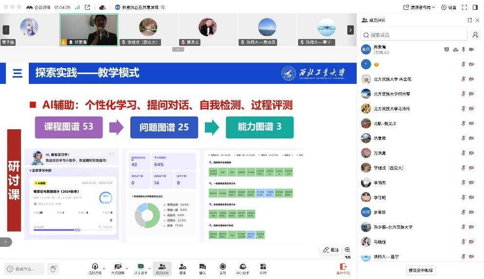 都琳从人工智能赋能教育的新趋势切入,分析了“师-生-AI”协同课堂教学模式的创新理念,结合西北工业大学《概率论与数理统计》课程的教学实践,详细阐释了将知识单元教学按“导论课-研讨课-总结课”三步法组织的创新设计。都琳还分享了AI技术在实现个性化学习、增强师生互动、优化教学评估等方面的具体应用案例,并针对智能时代教师角色转型、教学场景重构等关键问题提出了独到见解。报告结束后,都琳与线上线下参会老师进行了互动交流。参会教师纷纷表示,报告内容“既有前沿理论支撑,又具实操指导价值”,为探索AI与数学课程深度融合提供了新范式。