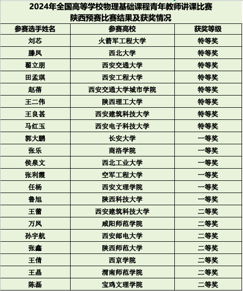 据悉,全国高等学校物理基础课程青年教师讲课比赛由教育部高等学校物理学专业教学指导委员会、教育部高等学校物理课程教学指导委员会和中国物理学会联合主办,是全国高校物理教学领域的最高赛事,分初赛(省赛)、复赛(地区赛)和决赛(全国赛)三个阶段进行。比赛为陕西省从事物理基础课教学的青年教师提供了交流教学方法、展示教学技能、提升教学水平的重要平台,通过向青年教师传递最先进的教学理念、教学模式、教学方法,将教改成果及时落地到一线教学环节,进一步推动各高校提高教学质量。