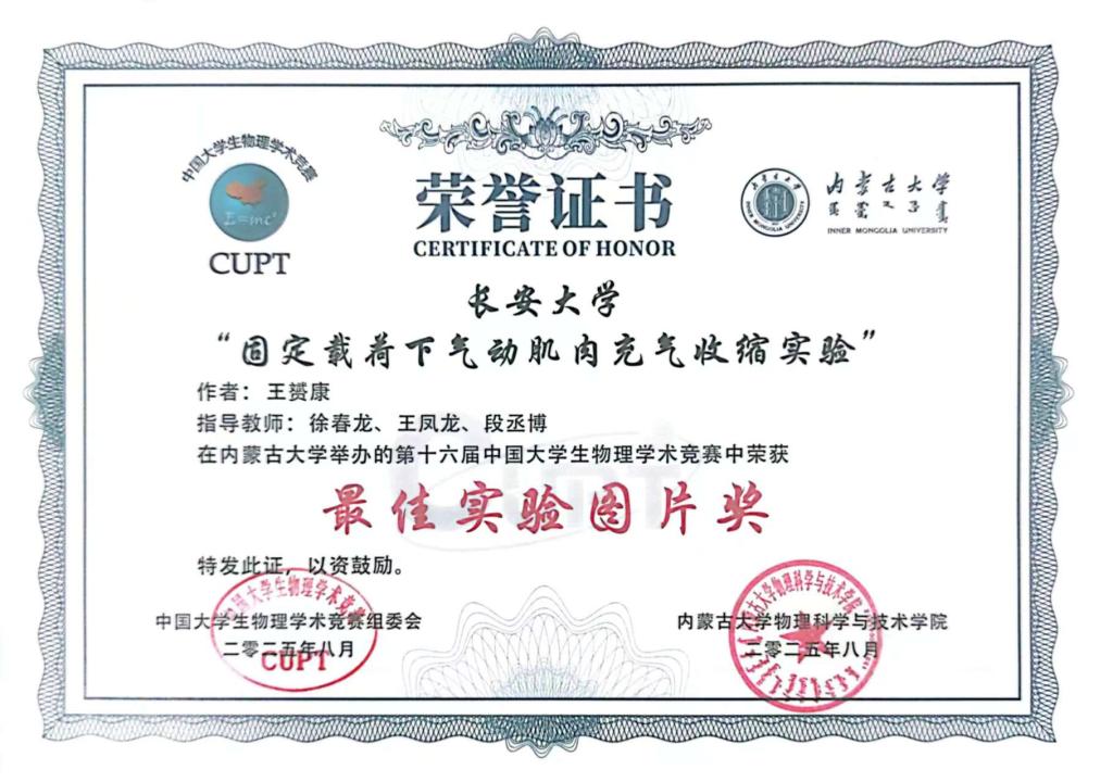 近日,第十六届中国大学生物理学术竞赛(China Undergraduate Physics Tournament,简称CUPT)在内蒙古大学圆满落幕。本届竞赛于8月14日至19日举行,延续团队赛和作品赛双轨模式,共吸引来自全国120余所高校参与。赛事竞争激烈,团队赛有66支高校代表队激辩交锋,作品赛有54所高校携优秀实物作品同台竞技。米兰中国选派的学生代表队表现优异,在作品赛赛道荣获全国三等奖,并在图片赛中凭借作品《固定载荷下气动肌肉充气收缩实验》斩获“最佳实验图片奖”,充分展现了我校学子优秀的物理创新与实践能力。