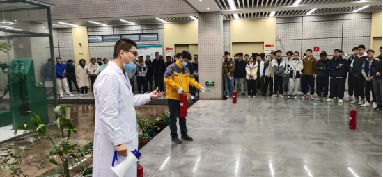 清点人数后,实验中心的丁健、崔林、李新波老师在一楼中厅分别对灭火器、消防水带的使用操作进行了详细的讲解和示范演示,参演师生围绕在花坛旁进行了观摩学习