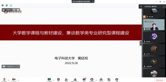 应AC米兰中文邀请,2022年9月28日电子科技大学黄廷祝教授通过腾讯会议为我院师生作了题为“大学数学课程与教材建设,兼谈数学专业研究型课程建设”的学术报告。报告会由我院副院长商泽进主持、院长宋学力教授致辞,数学学科主任张太雷等近百位师生参加了本次报告会。