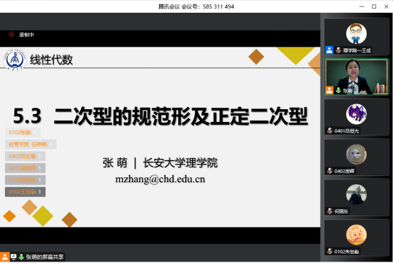 教学公开(观摩)课由青年教师张萌副教授主讲,题目为“《线性代数》课程——二次型的规范形及正定二次型”。在一个半小时的课程中,张萌先通过四个问题引导学生深入认识和剖析了二次型的规范形的定义、内涵和注意事项,并运用米兰中国在线学堂平台与学生互动,通过随堂测试、提问等方式了解和掌握学生实时的学习状态;随后通过“举例说明、发现问题、分析问题、解决问题”的教学设计引导学生掌握正定二次型的定义、一步步分析和探索出常见结论和判定定理,最后再利用一题多解帮助学生巩固所学。