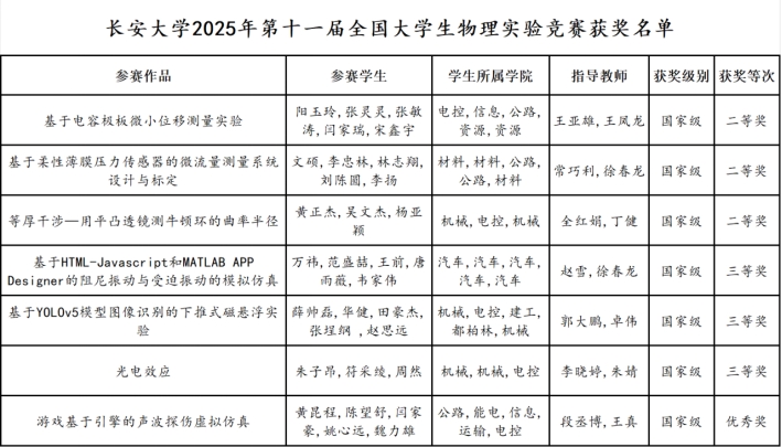 11月24日,2025年第十一届全国大学生物理实验竞赛(创新)决赛在长沙中南大学落下帷幕。我校7支代表队参赛,获得全国二等奖3项、三等奖3项、优秀奖1项。