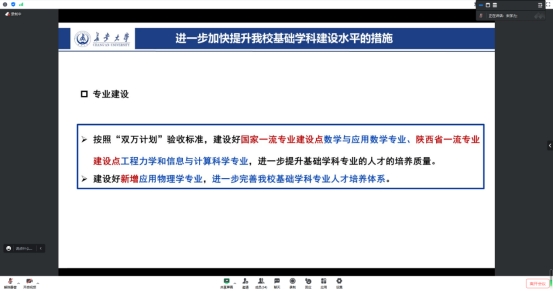 宋学力从参加主题教育的学习情况引入,与大家一起分享了学习的认识和感悟,重点从“完善基础学科专业体系”“进一步加强党的建设,为高水平基础学科建设提供坚强的政治保障和思想引领”“创新人才培养模式,优化本硕博贯通培养体系,进一步提升基础学科人才培养质量”“加强师资队伍建设”“进行有组织的教学研究,不断提升基础学科教师的教学研究能力”“加大基础理论及其交叉应用研究的组织力度,进一步提高原始创新能力和服务社会的能力”“加强基础理论研究平台和交叉学科科研平台建设,为基础学科建设提供高水平平台支撑”“加强与国际知名高校的交流与合作,进一步提升国际合作与交流能力”等八个方面提出了进一步加快提升我院基础学科建设水平的内容和措施。最后指出,希望全院师生能够以学习贯彻习近平新时代中国特色社会主义思想主题教育为契机,紧紧围绕主题教育的目标要求,以学铸魂、以学增智、以学正风、以学促干,把学习与履行工作职责结合起来,与学院年度党政工作要点结合起来,与推进绩效考核、博士点申报等各项重点任务结合起来,坚持学思用贯通、知信行统一,把习近平新时代中国特色社会主义思想转化为坚定理想、锤炼党性和指导实践、推动工作的强大力量,以高水平学科建设引领学院高质量发展,为早日实现把学院建设成“教学成果突出、专业和学科建设水平较高、在行业高校中有一定影响力的AC米兰中文”的奋斗目标不懈努力。