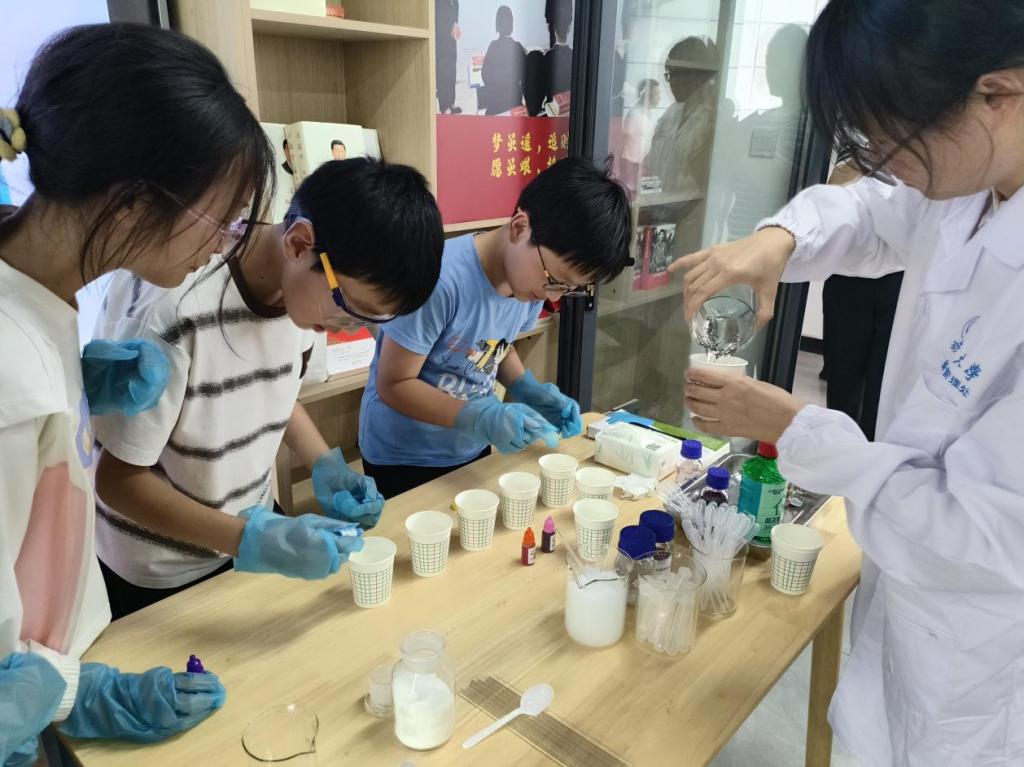 在“学习书屋”,AC米兰中文化学与材料科学系为青山镇中心学校的学生代表带来了“化学神奇世界:探索科学奥秘”主题科普实验演示,教师们通过“大象牙膏”、“下雪啦”、高锰酸钾褪色实验、烧杯里的“时光机”等趣味互动环节,带领孩子们观察“高锰酸钾褪色”、“聚丙烯酸钠吸水膨胀”、“碘钟与BZ振荡反应周期变化”等奇妙化学现象。实验间隙,机关党委组织了爱国主义教育知识竞答,通过单选、简答等形式激发学生参与热情,并向优胜者发放活动奖品。这种“科学实验+红色教育”的双轨模式,既通过沉浸式实操体验激发学生对科学的探索欲,又以知识竞答厚植家国情怀,实现“科创启智”与“立德树人”的深度融合。